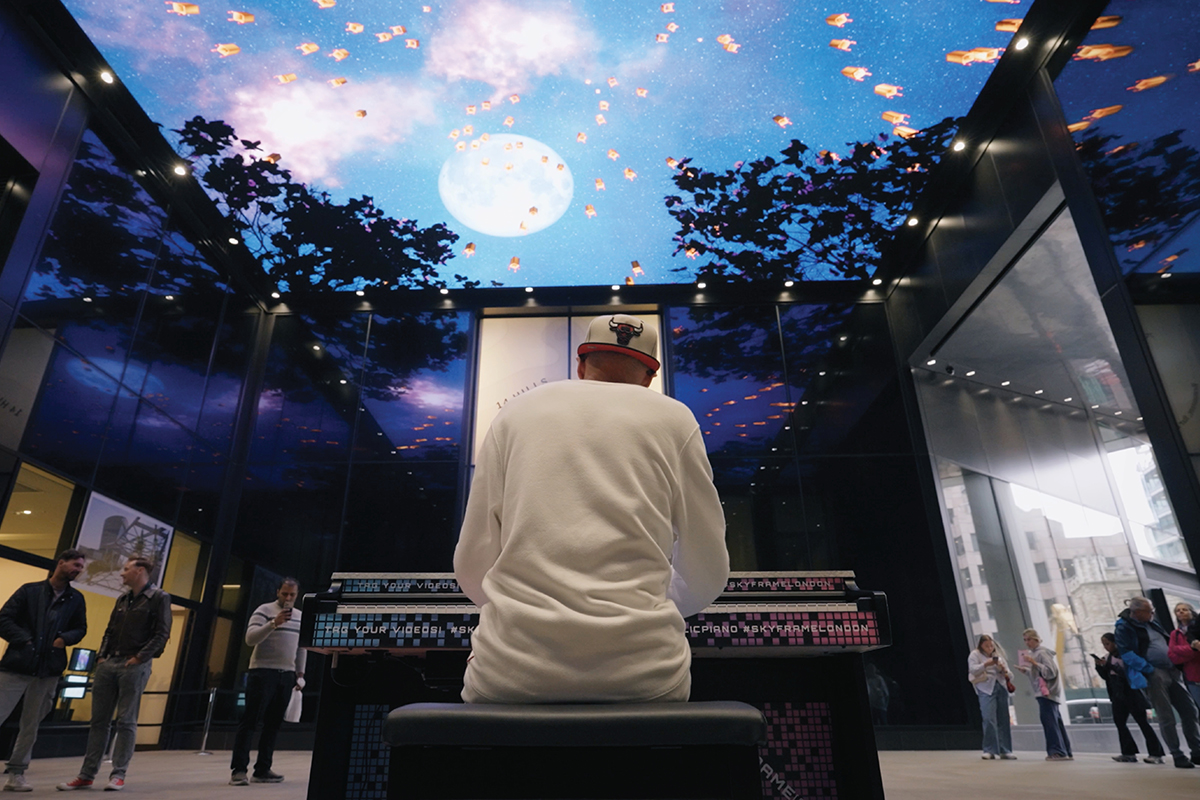 In 2025, the project evolved into Skyframe London: a civic digital arts platform, free and open to all. Its first activation, the Skyframe Piano, invited passers-by to create generative skyscapes overhead through music. From children striking their first notes to professional pianists playing daily, each performance reshaped the sky in real time — turning a city walkway into a stage for spontaneous creativity.